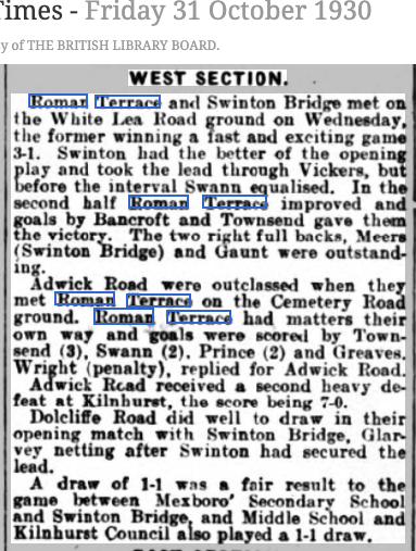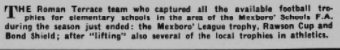 The final of the Totty Cup between Highgate and Wath Victoria on the Goldthorpe United ground on Monday evening produced one of the finest schoolboy games of the season. A splendid crowd assembled and for full 70 minutes had a hectic time. Highgate had the advantage of a breeze in the first half but had to play up the slope. For a period the Highgate boys had the better of the play and attacked repeatedly. Jefferson supported his forwards and although they showed plenty of energy they found the Victoria defenders in good form. The half-backs Mell, Wadeworth and Waggitt were marking their men effectively and on the occasions when the forwards eluded their halves, Stevenson nipped in and prevented them from coming too close.