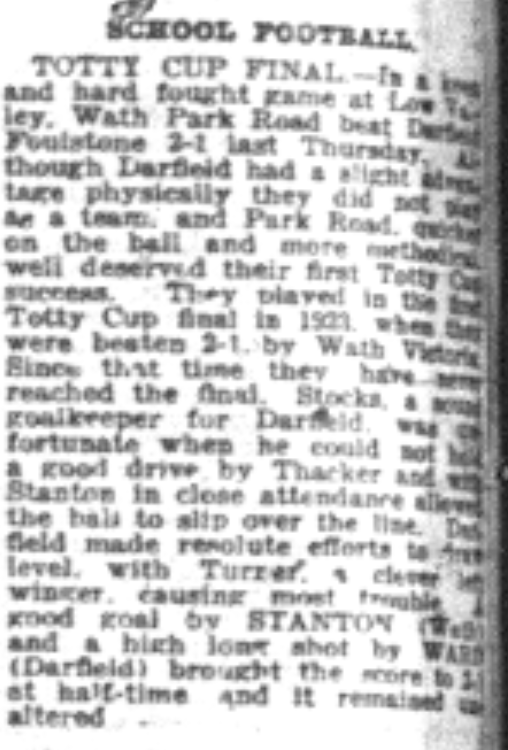 1945 Wath Park Road 2 Darfield Foulstone 1 Mark Jones (later of Manchester United) attended Foulstone school. He may have played in this competition. Share this: Click to share on X (Opens in new window) X Click to share on Facebook (Opens in new window) Facebook Like Loading...