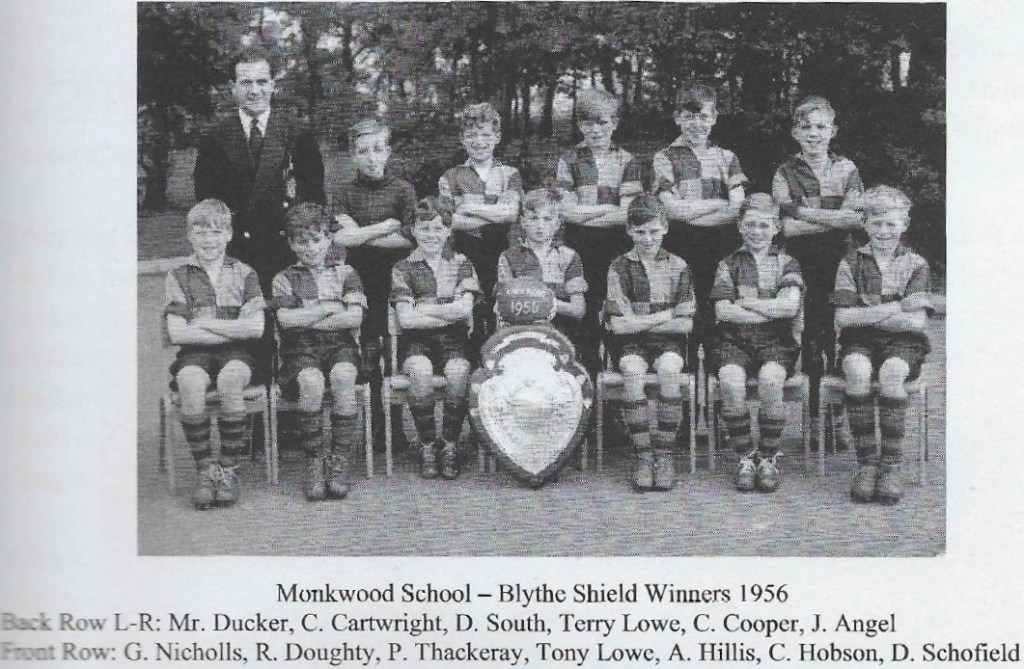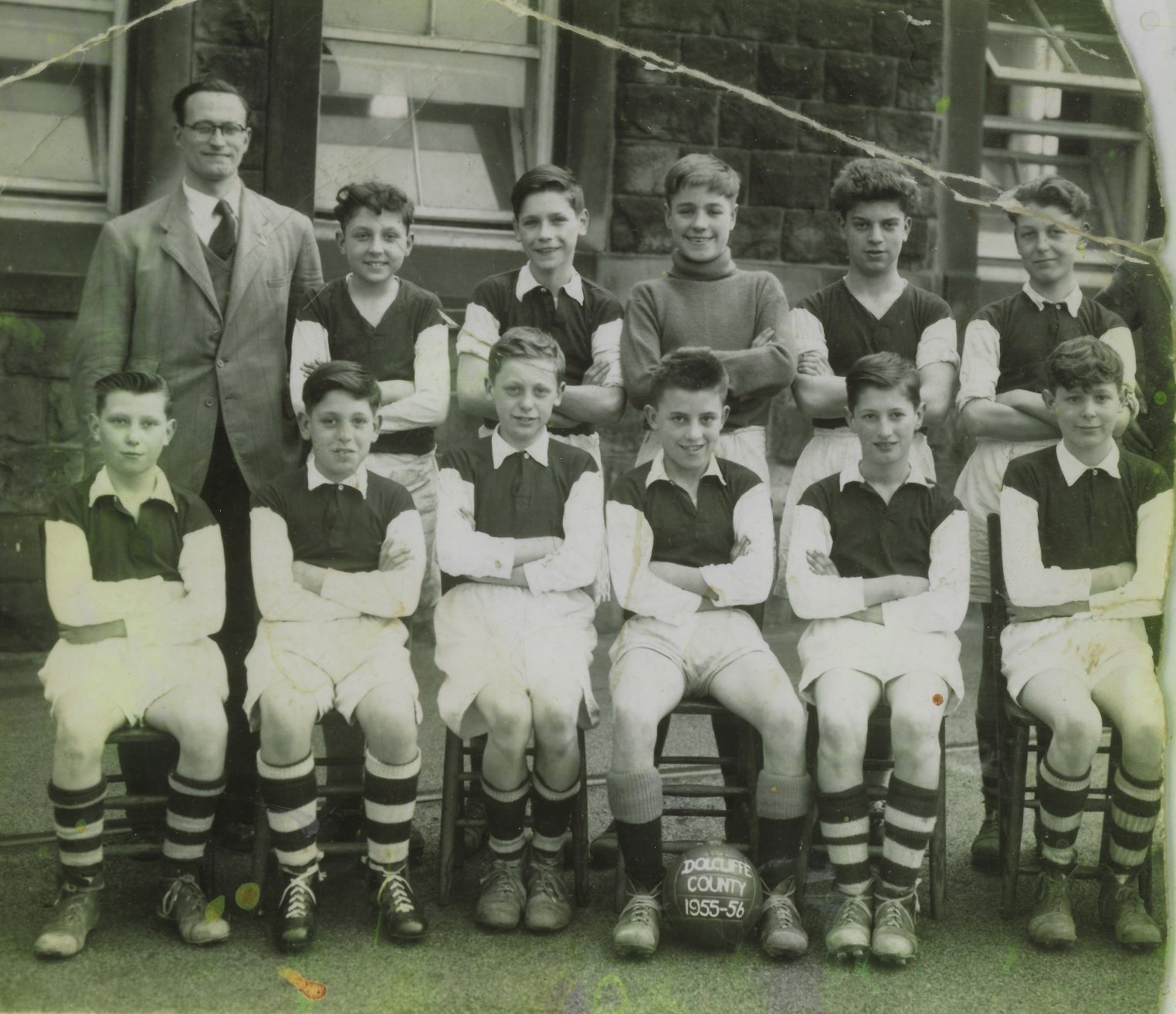 Teachers, Mr Simpson, Headmaster Mr Jones, Mr Long. Players L/R standing, Dave Bentley, Eddie Smith, Granville Calladine, Pete Raynor in goal, ? Stott , ?, Eric Clubley,. Seated L/R Tony Marklew, Tony (Ben) Baines, Billy Cook, Phil Hiles , Mick Swift .