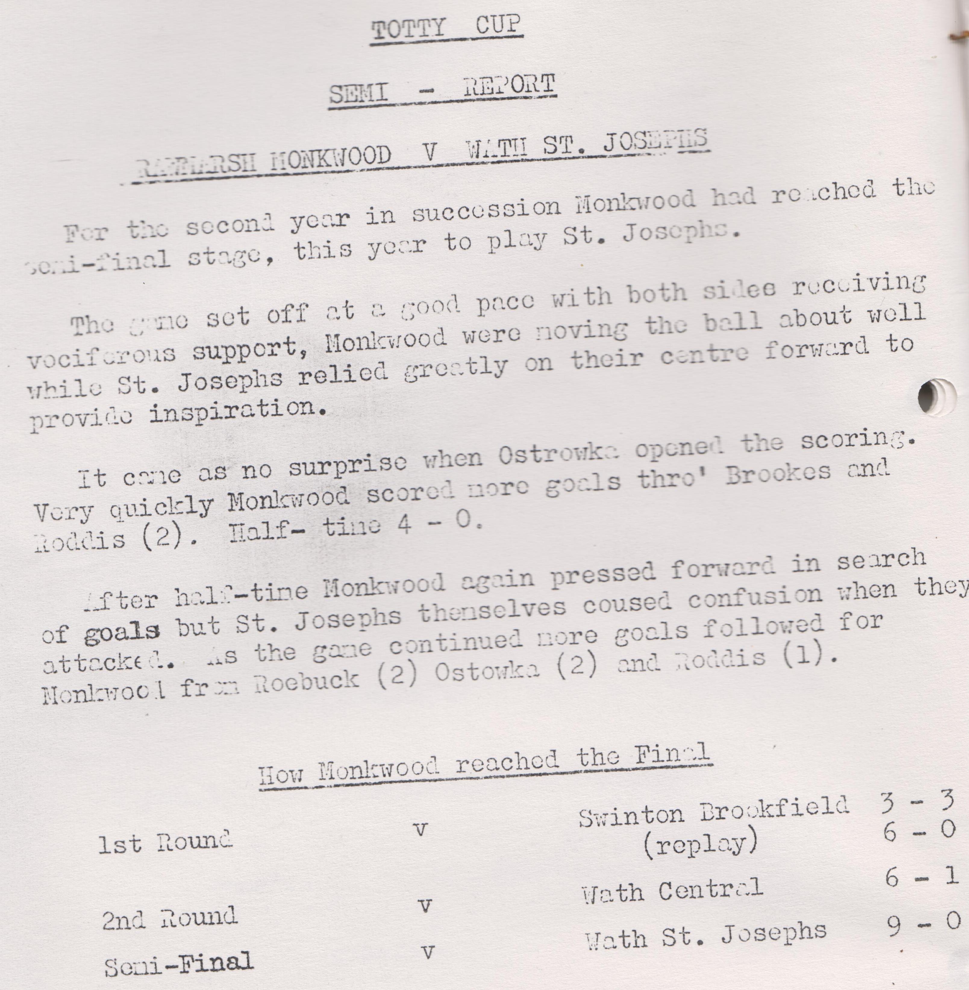 Newspaper report of Monkwood’s first round match and replay against Swinton Brookfield.