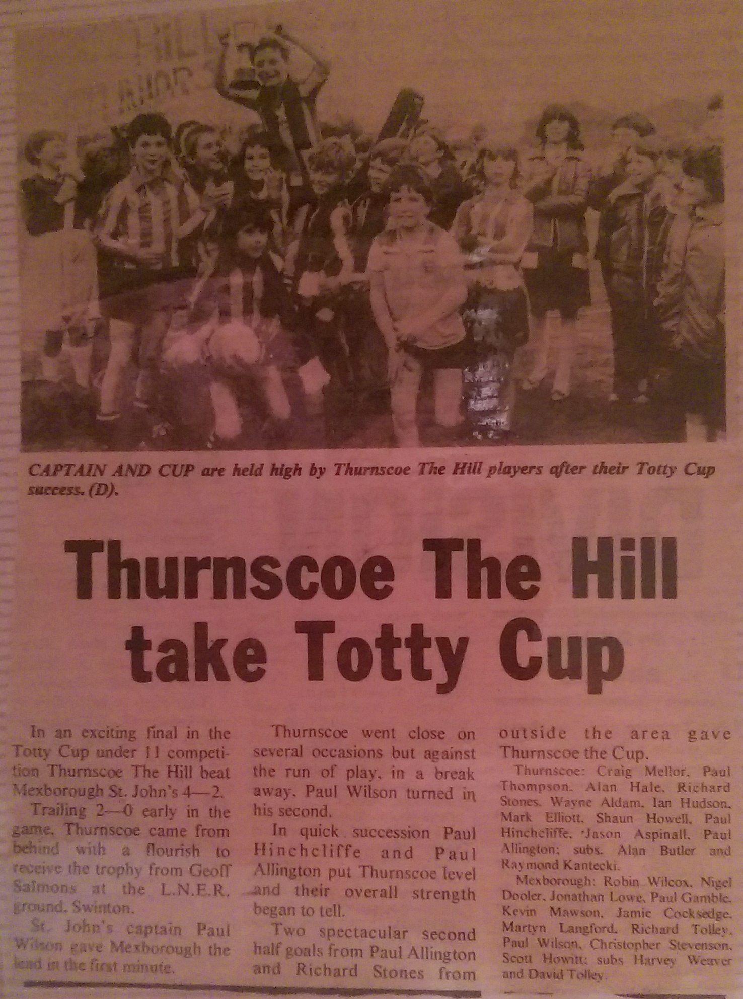 Andrew Vickers played for Swinton Brookfield who played Thurnscoe Hill in the semi final at the LNER ground. “Most of the school came down to watch us, ( had made a banner as well if memory serves me right) by the time they got there I think we were 2 down already. Lost 5-0 eventually I think.”