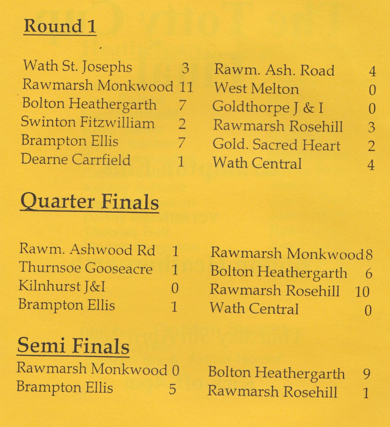 2001 Brampton Ellis 4 Bolton Heathergarth 0 If you have anymore information on this final, or previous rounds, please fill in the Contact Form below. Go backYour message has been sent Name(required) Warning Email(required) Warning Comment(required) Warning Warning. Submit Δ Share this: Click to share on X (Opens in new window) X Click to share on Facebook (Opens in new window) Facebook Like Loading...