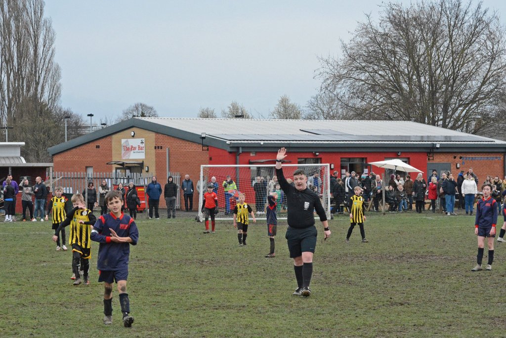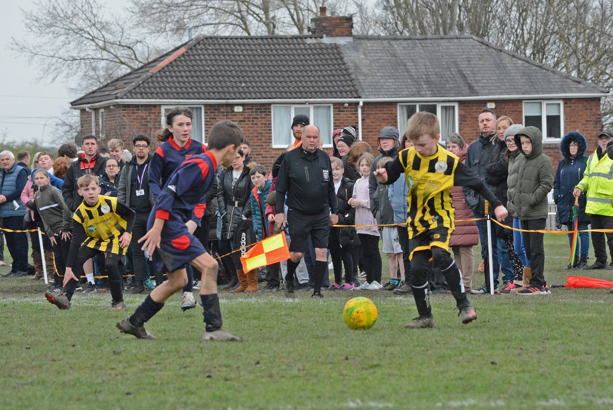 An amazing quarter-final played on a sloping pitch with the wind blowing downhill. Thorogate made the most of this with a 3-0 half-time lead. The small pitch meant that Thorogate made a defensive wall from the Windhill centre kicks – with a player on each post too! At full-time it was 4-4.