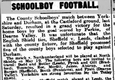 Albert Parkin scored both goals in the first ever Totty Cup final in 1923. It was a 2-0 win for Wath Victoria over their neighbours Park Road. In the same year Albert represented Yorkshire School boys (see photo of the cap) and possibly England schoolboys.
