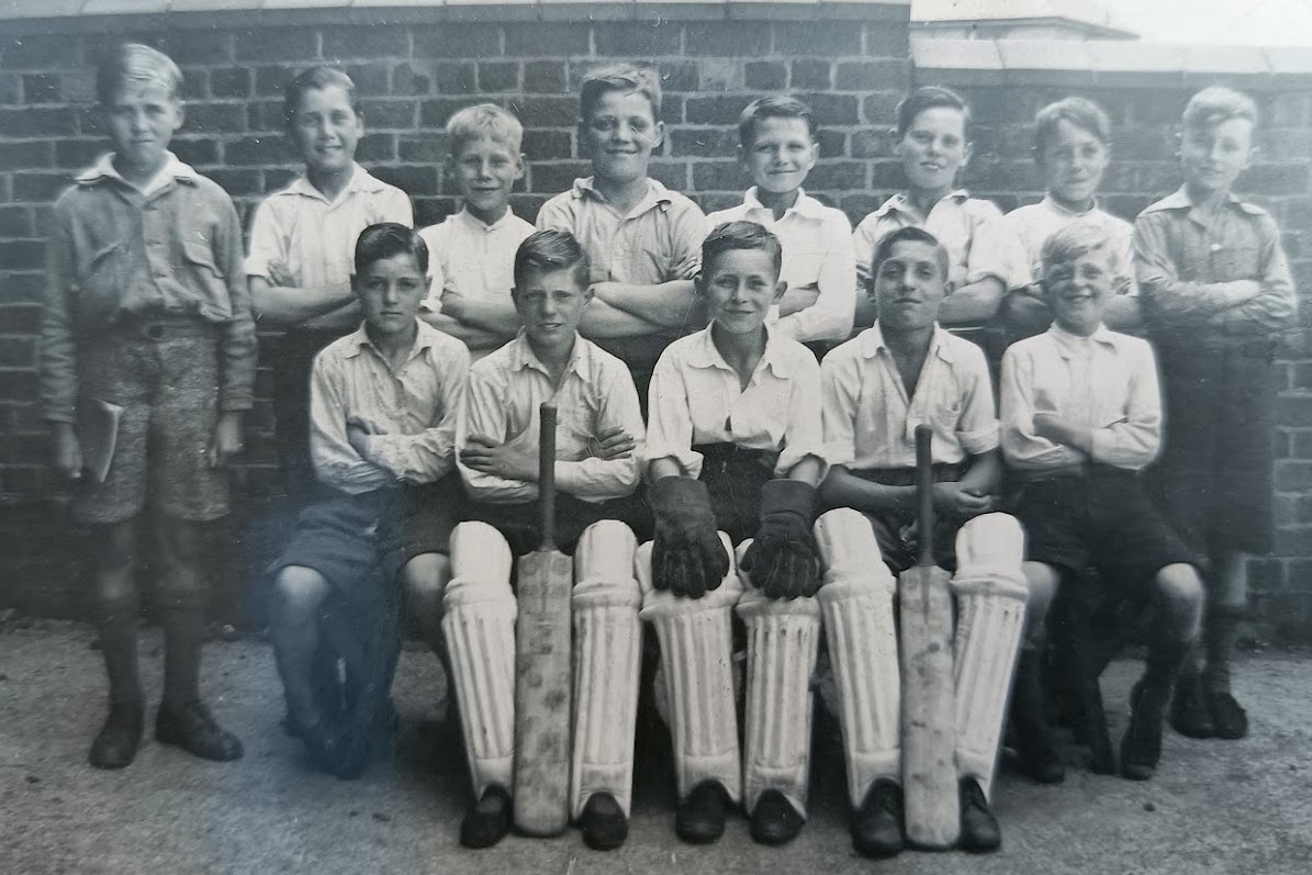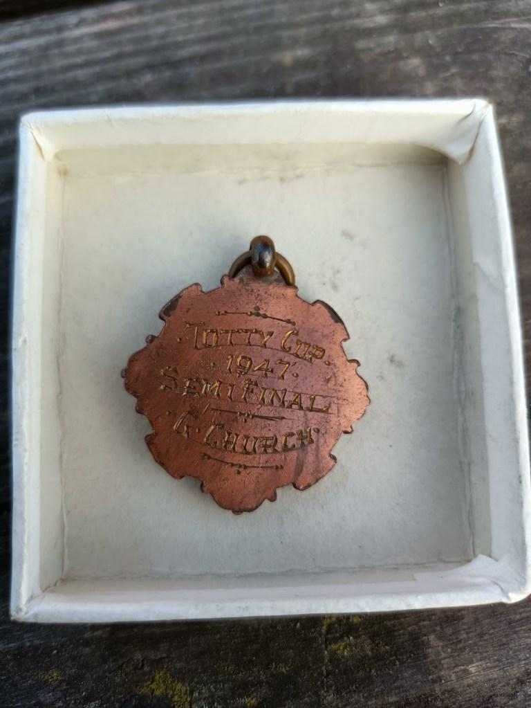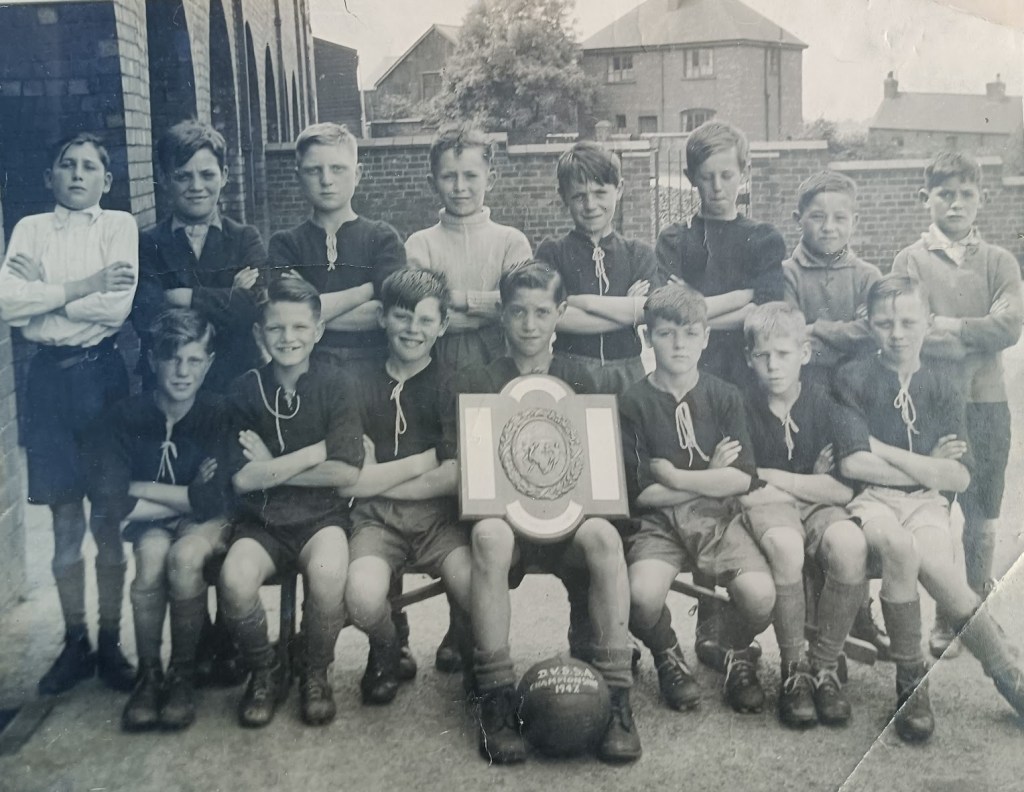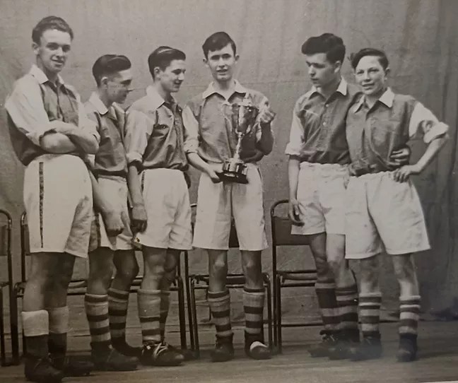 Geoff Church remembers “Because of post war rationing restriction there were no football shirts or shorts to buy. Mothers made the shorts from ex-blackout curtain material and knitted the shirts from red wool. My place in the team,as goalkeeper, was nothing to do with my ability, It was simply that my aunt Mary let me borrow her bright yellow polo jumper on match days.”