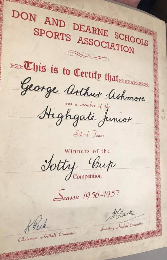 Arthur “Sab” Ashmore (born 1916) played in the 1929 and 1931 Totty Cup finals for Highgate. He is pictured above behind the shield in 1931. His son, Arthur (born 1946), went onto win the Totty Cup in 1957 – also with Highgate (see certificate)