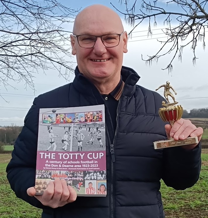 Phil Green captained Rawmarsh Monkwood to Totty Cup victory in 1979 – scoring all the goals in the final & replay. Phil is pictured in February 2024 with his silverware from ’79 and a copy of the centrenary book which shows his goal in the final (although he is out of shot).