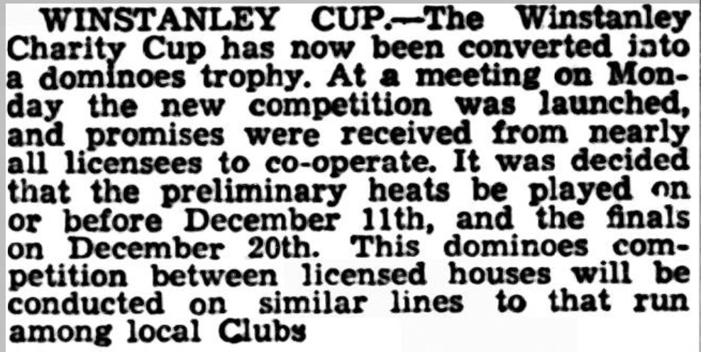 In 1937 it was decided to have the Winstanley Cup for a domino competition. The last winner was Mr J Townend of the Mechanics Institute in December 1939.